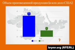 По данным Крымстата за 11 месяцев 2015 года общий объем товаров, произведенных в Крыму, составил 65,9 млн рублей (примерно 1 млн долларов США). В то же время в 2013 году объем реализованной промышленной продукции в АРК составил 26,5 млн грн (примерно 3,3 млн долларов США). Иными словами, в украинскую бытность Крым производил товаров в три раза больше.
