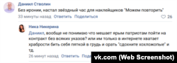 «Даниил, вообще не понимаю, что мешает ярым патриотам пойти на контракт без всяких указов? Или им только в интернете хватает храбрости?», – соглашается с ним Ника Никерина.
