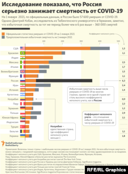 – Я слышал такое мнение, что не нужно, мол, смотреть на статистику, которую дают оперативные штабы, есть ведь данные Росстата, они тоже официальные и не так сильно отстают от избыточной смертности. Но опасность как раз в том, что сравнения – и не только досужие, которые мы делаем на основе онлайн-индикаторов, но и те, что используют в своих заявлениях российские чиновники, – основаны, как правило, как раз на данных оперативных штабов. Если они занижены в шесть раз, то и все эти заявления оказываются просто выдумкой. В реальности, видя динамику российской избыточной смертности до декабря и предполагая, что и в ближайшие месяцы она останется такой же, я боюсь, что Россия в итоге окажется где-то на уровне Латинской Америки по количеству смертей на душу населения, а может, и вообще на первом месте. Если смотреть на уже опубликованные данные – 360 тысяч избыточных смертей на конец декабря, – то на душу населения это уже сильно превысило уровень наиболее пострадавших от пандемии западноевропейских стран, как, например, Испания, Италия, или Великобритания, – рассказал Радио Свобода Дмитрий Кобак.
