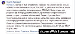 «Сегодня ВСУ отработали красиво по классической схеме: AGM-88 HARM вывели из строя РЛС/ПВО, а дальше в пробитое «окно» залетели пока ещё не анонсированные ATACMS (были слухи, что решение об их передаче могло быть принято после российского военного преступления в Оленовке). Таким образом, была уничтожена/поражена очень жирная цель, так как на этом аэродроме в Новофедоровке базируется 43-й отдельный морской штурмовой Севастопольский авиационный полк (на архивных спутниковых снимках видно, что на этом аэродроме базировались Су-24, Су-24МР и Су-30СМ)», – выдвигает версию Сергій Ласкавий.