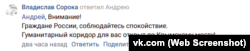 Владислав Сорока пишет здесь: «Внимание! Граждане России, соблюдайте спокойствие. Гуманитарный коридор для вас открыт по Крымскому мосту!»
