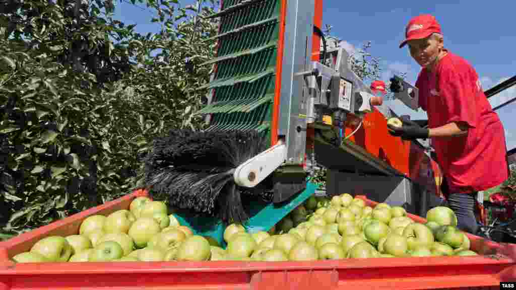 В селе Софиевка Симферопольского района начали сбор урожая яблок комбайном Munckhof.