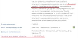 Помещения исторических зданий в Симферополе выставлены на продажу Министерством имущественных и земельных отношений подконтрольного России правительства Крыма. Реализовать их на аукционе планируют в конце октября. Судя по документам нынешних и предыдущих торгов, дома купцов XIX века скупают влиятельные бизнесмены, связанные с нынешними российскими властями полуострова. Причем нередко объекты исторического наследия со столетней историей достаются им по цене современной квартиры.