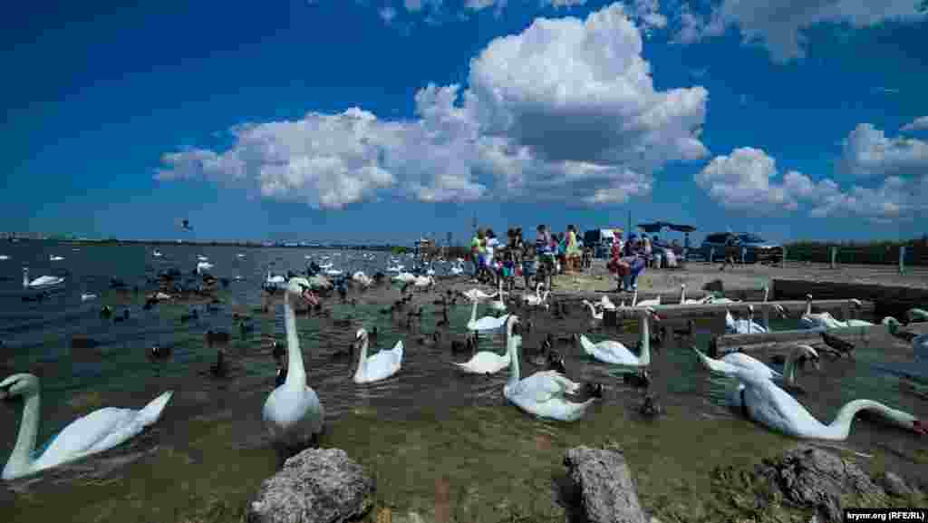 Перелетные лебеди-шипуны, которые раньше гнездовались на северо-западе Крыма в Раздольненском районе, уже как несколько лет облюбовали ближайшую к Евпатории часть соленого озера Сасык-Сиваш.
