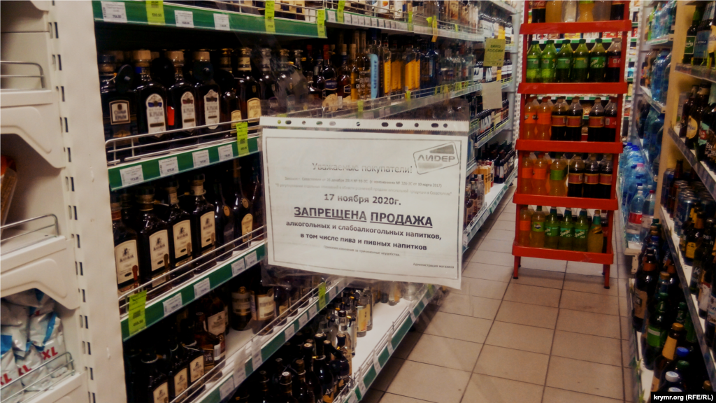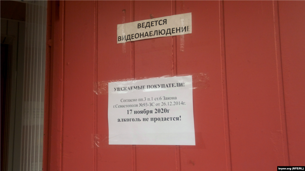 На дверях и витринах магазинов разместили объявления, в которых предупредили покупателей, что продажа алкоголя 17 ноября запрещена. В супермаркетах, по сообщениям корреспондента Крым.Реалии, доступ к полкам с алкоголем перекрыт. Специализированные магазины по продаже спиртного закрыты, однако некоторые пивные бары алкоголем все-таки торгуют.