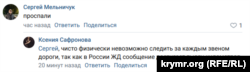 «Проспали», – пишет Сергей Мельничук в сообществе «Инцидент Крым|Симферополь|Севастополь ДТП ЧП» социальной сети «Вконтакте». «Сергей, чисто физически невозможно следить за каждым звеном дороги, так как в России [протяженность путей] ЖД-сообщения достигает тысяч километров», – отвечает ему Ксения Сафронова.