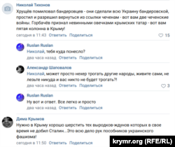 Некоторые комментаторы разжигают межнациональную рознь, искажая при этом историю. «Хрущев помиловал бандеровцев – они сделали всю Украину бандеровской, простил и разрешил вернуться из ссылки чеченам – вот вам две чеченские войны. Горбачев признал невинными овечками крымских татар – вот вам пятая колонна в Крыму!» – пишет пользователь под ником Николай Тихонов.