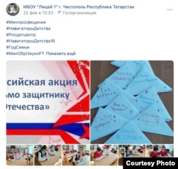 Школы в регионах в своих сообществах в социальной сети "ВКонтакте" активно отчитываются о сборе "гуманитарной помощи" для российских военных. Публикации сопровождаются хэштегами "Своих не бросаем" и "Мы вместе". Так, в феврале этого года астраханская школа отчиталась, что направила на фронт сухой душ для российских военных. Совместно с родителями учащиеся саратовской школы №64 собрали 10 пакетов "гуманитарной помощи", в которых были продукты питания, средства гигиены, медикаменты и предметы первой необходимости.