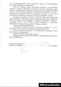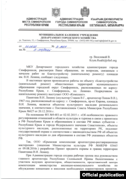 «Границы объекта культурного наследия, а также предмет охраны (памятник Ленину – КР) установлены согласно проекту и ограничиваются монолитным постаментом и железобетонной базой под ним. Таким образом, цветники и первый ярус постамента не входят в охраняемую территорию объекта культурного наследия и могут быть благоустроены в рамках капитального ремонта площади Ленина», – сообщает начальник департамента городского хозяйства российской администрации Симферополя Евгений Маляров.