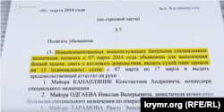 «Нижепоименованных военнослужащих батальона специального назначения полагать с 7 марта 2014 года убывшими для выполнения боевой задачи, снять с котлового довольствия, выдать сухой паек сроком на 11 (одиннадцать) суток с 7 марта по 17 марта», – сказано в документе, а следом идут фамилии.